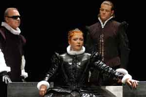 Ebben a pillanatban mi, nézők, világosan meggyőződhetünk arról, hogy Alföldi Róbert nem igazán érti, vagy nem akarja érteni Schiller drámájának lényegét. Pedig azzal, hogy néhány udvari karaktert eltorzít – lényegesen szűkíti Erzsébet királynői mozgásterét. Aki mintha csak az eltitkolt bujasága miatt szenvedne, egy politikai szempontból indifferens értékű udvartartás élén… Ez a végső jelenetben csúcsosodik ki, amikor Erzsébet szeme elé illeszti egyetlen józan tanácsadója fekete szemüvegét. Ki eddig lelki vakságban szenvedett, lám, most végképp a homályba merül, értelmezhetjük ezt a képet, valahogy így; épp csak az a baj, hogy sem a kor történelmi konfliktusa, sem a két nő párbaja – nem erről szólt. Nem az egyik feltétlen győzelméről a másik fölött.