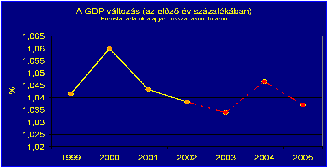 Az ábra világosan mutatja, az Orbán kormány utolsó két éve alatt csökkent a növekedés üteme. Ehhez képest a szocialisták büszkén szokták saját jó eredményeiket emlegetni. Az Eurostat adatai alapján az összehasonlító (1995. évi) árakon számolt adatokból azonban az is jól látszik, hogy a 2002 év előtti illetve utáni időszak növekedési üteme eltérő: az Orbán kormány alatt nagyobb volt a gazdasági növekedés, mint mostanában.