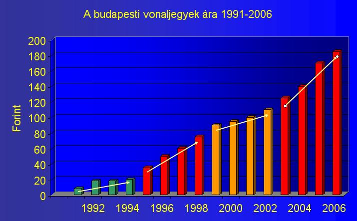 A fővárosi tömegközlekedésben a jegyek árára a főváros tesz javaslatot, de azt csak a pénzügyminiszter jóváhagyásával lehet kihirdetni. Az ábra világosan mutatja, hogy a gyors áremelkedések mindig a szocialista kormányzás alatt történtek. (Az ábrán a jegyek árát folyóáron tüntettük fel. Az adatok a Budapest Riport különszámából valók.)