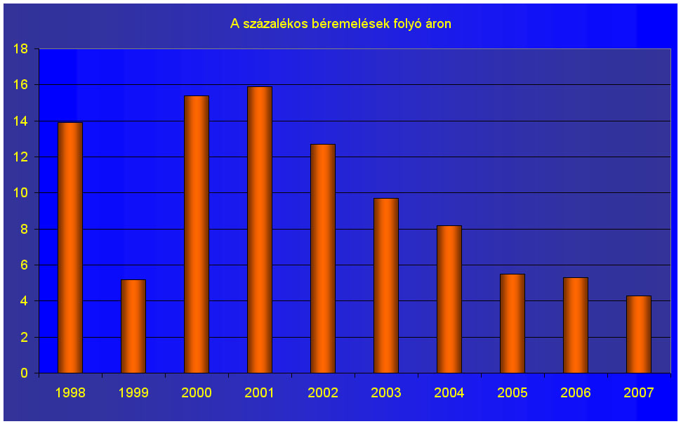 Az Orbán kormány alatt - az 1999-es évet kivéve minden évben 13 százalék feletti béremelés történt. A Medgyesy-Gyurcsány éra alatt az évenkénti béremelés százaléka folyamatosan csökkent. A 2002-es 12 százalék feletti emelést a 100 napos kampány-igéret teljesítése eredményezte, amelynek alapját az Orbán-kormánytól maradt összegek képezték.
