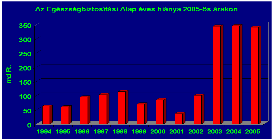 Az ember mást sem hall, ha már az egészségügy szóba kerül, hogy nagy a baj, hogy soha ilyen rossz helyzetben a kórházak nem voltak. Így azután nagy meglepetés ha rátekintünk a fenti ábrára, amely az Egészségbiztosítási Alap hiányát mutatja 1994 óta. Az összehasonlíthatóság érdekében az ábra a hiány mértékét a 2005-ös árakon tünteti fel. Bizony, amióta a Medgyessy-Gyurcsány csapat tervezi a költségvetést, a hiány három-négyszeresére nőtt. Ez a hatalmas deficit úgy keletkezett, hogy a kiadási oldal százmilliárdokkal megszaladt, s ezt a bevételi oldal nem követte. Ezek alapján azt hihetnénk, hogy az egészségügyi ágazat sokkal jobb helyzetben van, mint az előző ciklusban. Ám a mindennapi tapasztalat ennek az ellenkezője. Igaz, 2002 végén volt egy komoly béremelés, ennek forrását azonban a költségvetés nem biztosította, s sem a működtetésért felelős egészségbiztosítási alap, sem az intézetek tulajdonosai nem képesek a rendszerre ráerőltetett béreket kifizetni. A bérek ráadásul így is alacsonyak, s az egész ágazatban folyamatosan nő a feszültség. Meg a deficit.