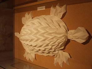 a terítés művészetét bemutató kiállítás egy darabja: damaszt szalvétából hajtogatott teknős