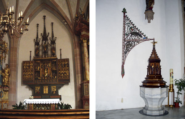 Bár volt konkrét célunk is, amiért ide jöttünk. Plébániánk, a Zugligeti Szent Család templom csodálatos mozaik képe ugyanis a meráni Angolkisasszony zárdatemplom mintájára készült. Eredeti tervem szerint itt a két képet együtt szerettem volna bemutatni. Sajnos tervünk nem sikerült. A templomot ugyan megtaláltuk, de az, szemmel láthatóan "üzemen kívül" van. Semmiféle, még csak utalást sem találtunk arra vonatkozóan, hogy a templomban bármiféle élet folyna. A zárda gimnáziumként funkcionál, s érthetően nyáron nem működik. Besétáltunk az udvarra is, de életnek nyomára sem akadtunk. Így nem marad más, mint csak a mi templomunk szentélyének Zsellér Imre műhelyében készült gyönyörű mozaik-képét mutathatom meg: