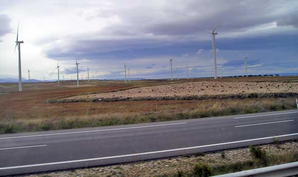 A táj, ahogy Zaragóza felé mentünk rendkívül kopár, kietlen volt. Feltehetően ez a kopárság is hozzájárult ahhoz, hogy a szél zavartalanul száguld mozgásba hozva a megszámlálhatatlanul sok szélerőművet.