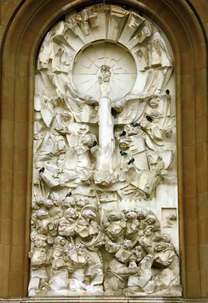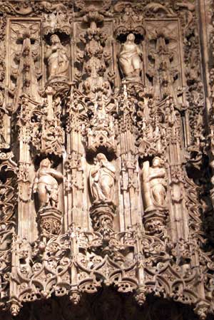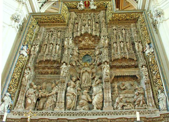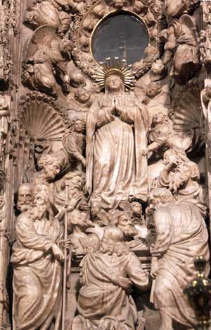 Az alabástrom főoltár Mária születését (két oldalt) és mennybevitelét (középen) mintázza meg