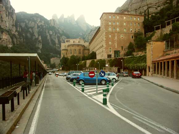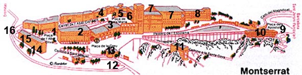 A monostor ma is a bencéseké. Évi egymillió zarándok keresi fel, s szombat lévén most is nagyon sokan voltak fent a hegyen. Meglepetésünkre a buszparkolóba érkezésünkkor tudomásunkra hozták, hogy a busz nem mehet tovább, a csomagjainkért majd a szálloda leküld egy furgont, s mi kézicsomagjainkkal gyalogoljunk fel. A repülőtéri várakozás után ez újabb várakozást jelentett a csomagszállító kocsira, majd felgyalogoltunk. Alapvetően nem nagy távolság (az alábbi rajzon a 9-es ponttól az 1-es kapun keresztül a 4-essel jelzett szállodánkig), de voltak közöttünk 70 éven felüliek is szép számmal, akiknek főleg a kézitáskák jelentettek problémát. Férfi-társaink fizikai segítségével valamennyien feljutottunk a szállásunkra. Ez a többszörös időkiesés azzal járt, hogy legelső tervezett programunk - a Santa Cueva kápolna meglátogatása - ahol a Mária-szobrot megtalálták - elmaradt. A templomban a vesperás, a csodálatos környezet és az esti kivilágítás azonban bőven kárpótolt minket az elmaradt programért.