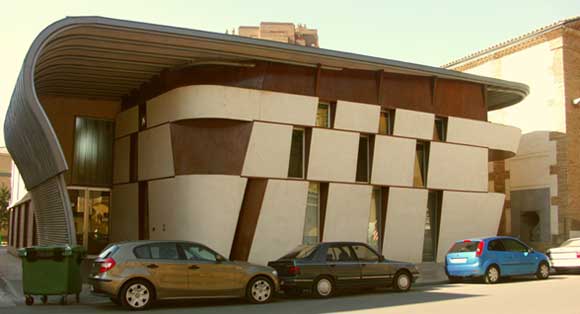 Huesca egyik főutcáján áll ez modern épület, s tőle jobbra, a közvetlenül mellette álló ház homlokzata pedig ilyen  Ø
